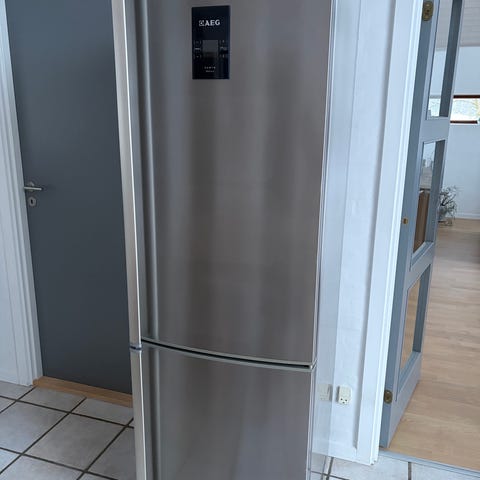 Køle-fryseskab i stål med fryser nederst. Skabet har kølerum øverst med flere glashylder og dørhylder til opbevaring af madvarer og drikkevarer. Nederst er der frysesektion med skuffer til frosne varer. Egnet til almindeligt køkkenbrug med separat køle- og frysefunktion i ét skab, 1/2 år gl nypris 3500kr