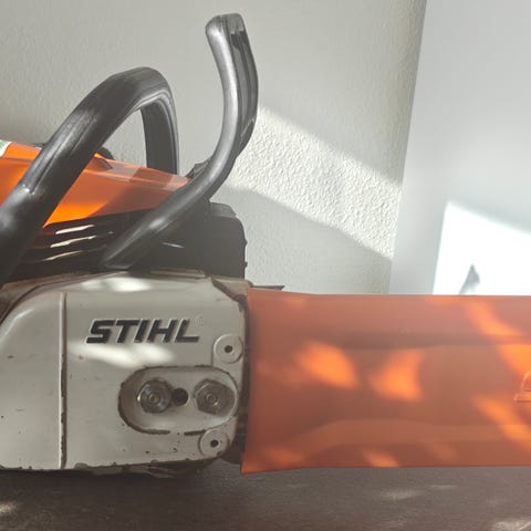 Benzindrevet kædesav egnet til skæreopgaver i træ, fx fældning og opskæring af brænde. Savkæden er dækket af en orange sværdskede under opbevaring og transport. Maskinen har for- og baghåndtag samt kædebremse foran håndtaget for øget sikkerhed under brug.