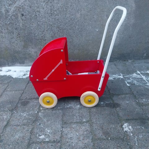 Reserveret….Rød træ dukkevogn. Mærket Micki.
