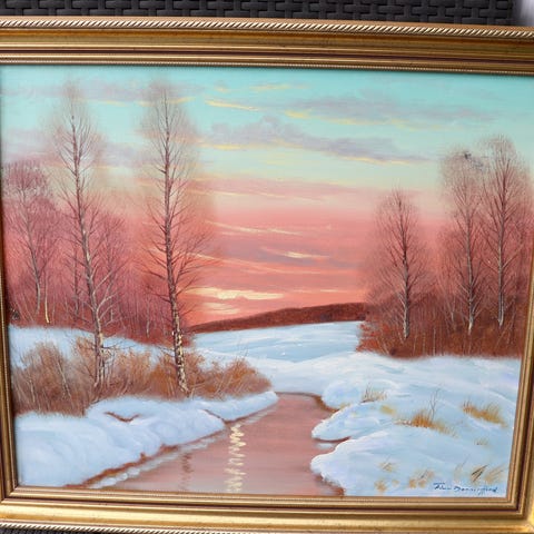 Finn Dannefjord maleri med vinterlandskab og solnedgang. Motivet viser et snedækket landskab med træer uden blade og en farverig himmel i baggrunden. Maleriet er indrammet i en rektangulær træramme med profileret kant. Velegnet som vægudsmykning i stue, gang eller kontor.