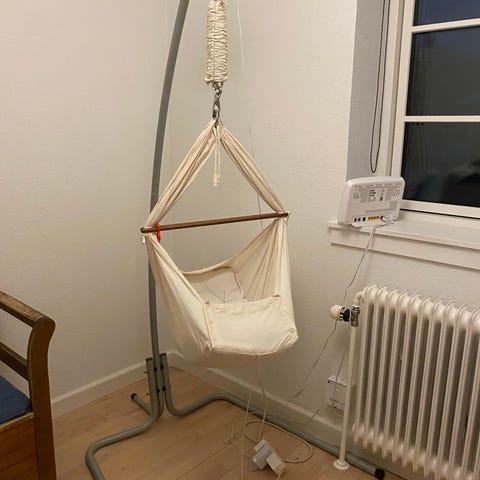 Moonboon slyngevugge med stativ og motor sælges. Der medfølger karmbeslag og ekstra fjeder. Der er afstiver madras med også. Stativ købt efter 2025, motor er brugt til 2 børn.