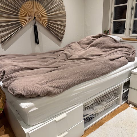 IKEA seng med lamelbund og integreret opbevaringsreol under sengen. Sengen består af en ramme med lamelbund, hvor madrassen ligger ovenpå, madressen kan ikke købes med.