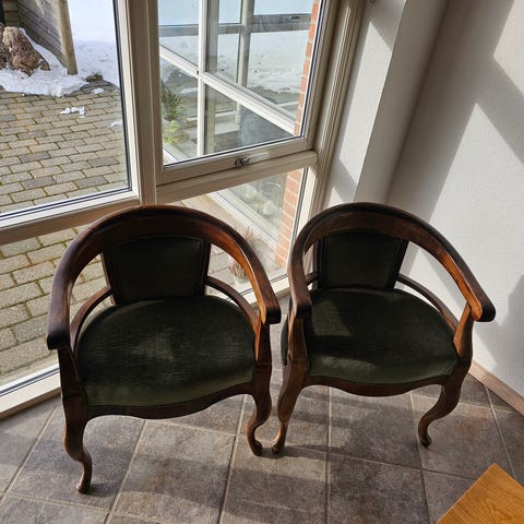 To stk flotte mørkbejsede antikke stole med fejlfri og ny læderpolstring sælges.