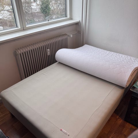 IKEA seng med madras. Rammekonstruktion med hovedgærde og madras i standard dobbeltsengsstørrelse. Egnet til soveværelse eller gæsteværelse. Neutralt, lyst tekstil på madras og sengekant, som passer ind i de fleste indretninger.