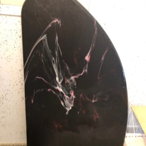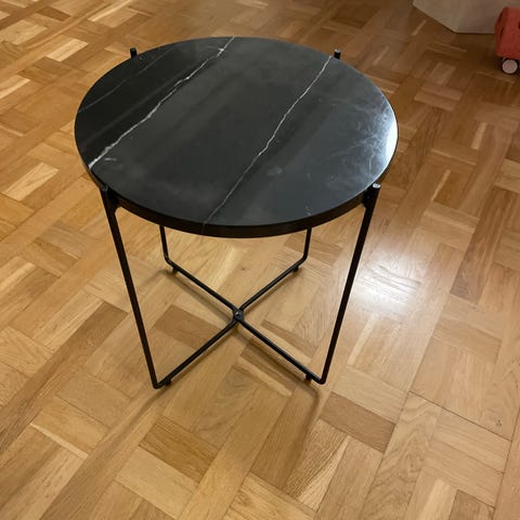 Grøn marmor bordplade og sort stel. Stellet kan klappes sammen og bordpladen ligger løst på toppen.