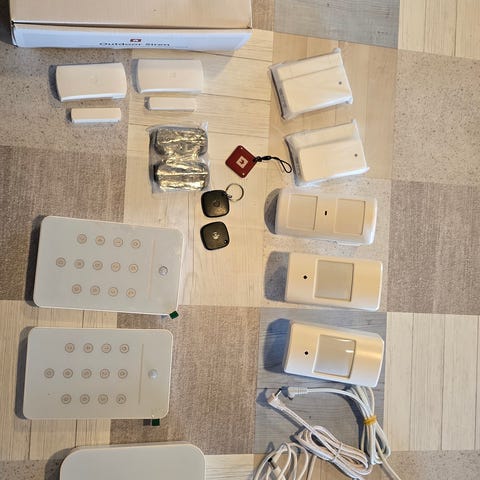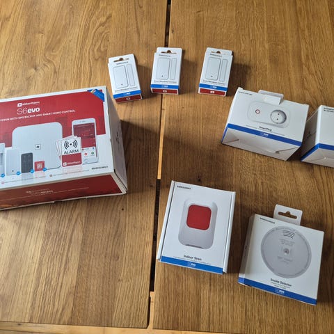 Sikkerthjem villapakke S7pro alarmsæt og overvågningskamera i hvid. Sættet omfatter centrale enheder, sensorer og tilbehør til overvågning og sikkerhed i hjemmet. På billedet ses blandt andet hub/base-enhed, 1 numpad,