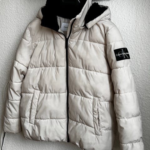 Calvin Klein vinterjakke til kvinder i sort, str. M. Lang, vatteret model i polyester med gennemgående lynlås foran. Jakken har hætte med aftagelig kunstpelskant (vurderet ud fra billeder), sidelommer og ribkant ved ærmerne. Diskret Calvin Klein-logo på bryst og ærme. Velegnet som varm overtøjsjakke i de kolde måneder. Jakken har aldrig været brugt, så den er som helt ny :).