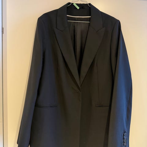 COS blazer til kvinder i størrelse 44. Blazeren er mørkeblå nålestribet i 85% uld, 10% polyamide, 5% elastan. Klassisk model med revers, knaplukning med 1 knap foran og paspolerede lommer. Ærmerne har knapper ved manchetterne. Rigtig god stand. Ingen synlig slid. Nyrenset.