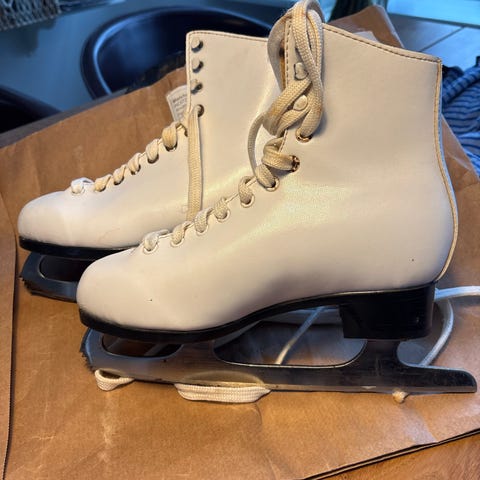 Kunstskøjter i hvid, str 38. Klassisk model med høj skaft og snørelukning, som giver støtte omkring anklen. Skøjterne har fastmonteret klinge under sålen, egnet til brug på isbaner til leg, træning eller almindelig skøjteløb. Materialet fremstår som glat overflade med polstring ved skaftet for øget komfort.
