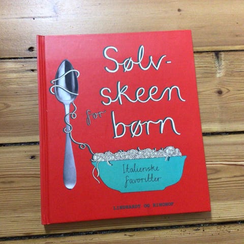 Sølvskeen for børn kogebog med italienske favoritter. Bogen indeholder opskrifter til børn med fokus på italiensk madlavning. Udgivet af Lindhardt og Ringhof som en børnevenlig udgave af den klassiske kogebog "Sølvskeen" med tilpassede opskrifter og illustrationer til yngre læsere. Solafbleget. Sender ikke for køb under 200 kr.
