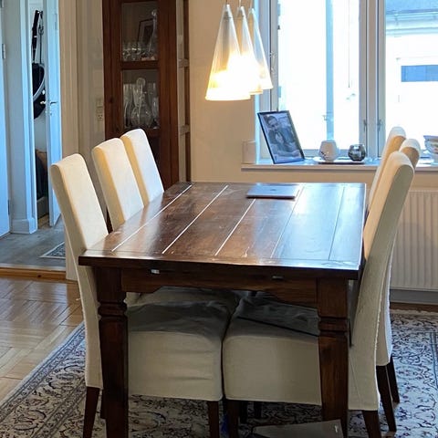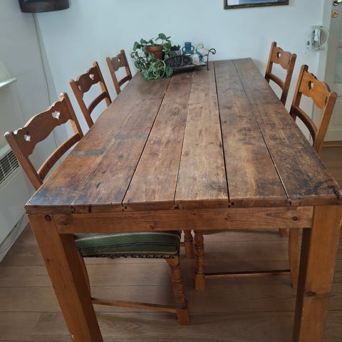 Bordet har et lille hak i det ene hjørne, og lidt af guldet på bordbenene er skabet af.