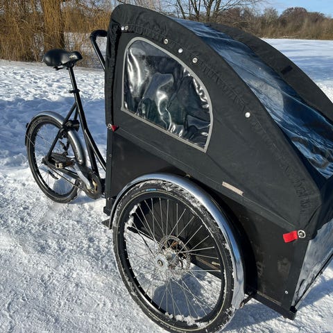 Rigtig fin nyrenoveret ladcykel med kaleché, bænk, seler, lås, ringeklokke.