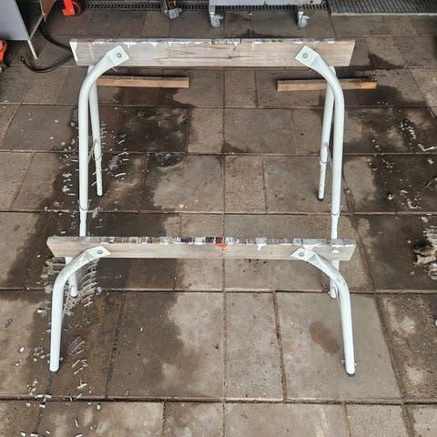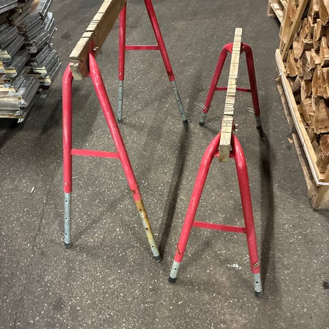 Savbuk i ukendt mærke udført i hvidlakeret metal med overligger i træ. Velegnet som støtte til savning og andre gør-det-selv opgaver, hvor der er behov for en stabil arbejdsbuk. Konstruktionen består af to sammenføjede bukke med skrå ben og træklods øverst til understøtning af emner under arbejde.