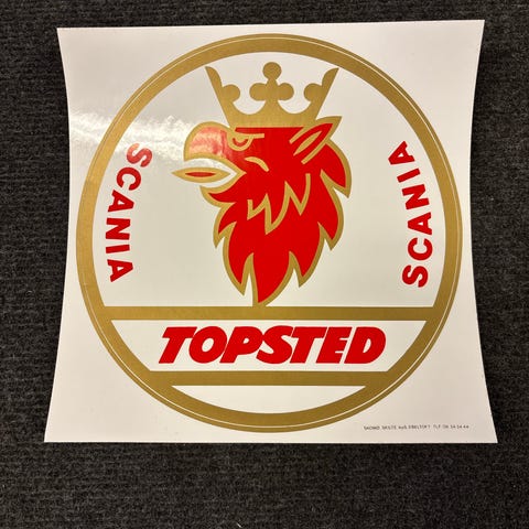 Scanius klistermærke med rundt logo og teksten "Topsted Service". Motivet viser en figur i arbejdstøj i blå og hvid. Diameteren er ca. 20 cm, som vist på billedet med tommestok. Klistermærket leveres på hvid baggrund og er egnet til montering på glatte overflader som f.eks. værkstedsindretning, døre eller maskiner.