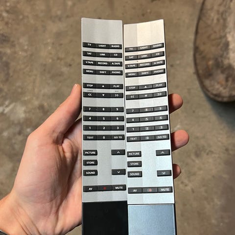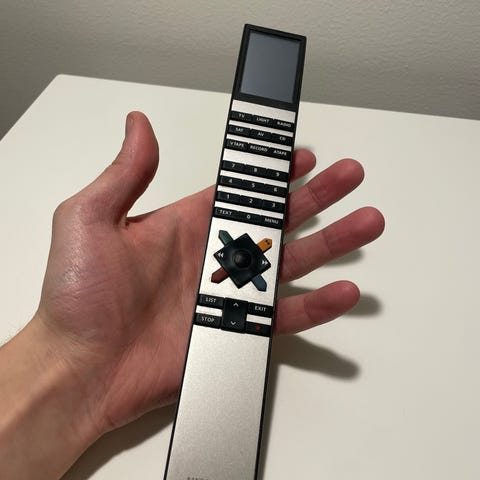 Bang & Olufsen BeoRemote fjernbetjening i sølvfarvet metal med sort front.