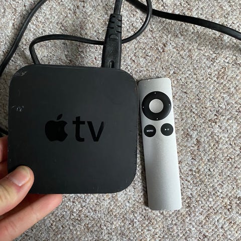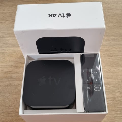 Apple TV 4K med fjernbetjening, model A1842 med 32 GB lagerkapacitet. Enheden understøtter opløsning op til 2160p UHD ved 60 Hz med HDR10. Leveres i sort farve og tilsluttes via HDMI og strømledning (kabler som vist på billederne). Velegnet til streaming af tv, film, musik og apps via tvOS-platformen.