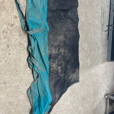 Amigo vinterdækken. Str 145. 350g. Der er ringe til at montere hals. Med krydsgjord og halestrop. Dækken er helt og intakt. Lidt affarvet i den blå farve. Lidt rust i spænder. Alt er intakt.