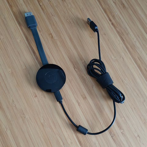 Google Chromecast medieafspiller. Enheden tilsluttes via HDMI til et tv eller en skærm og får strøm via USB. Chromecast bruges til at streame lyd og billede fra kompatible enheder som smartphone, tablet eller computer til tv’et over et trådløst netværk. Velegnet til afspilning af film, serier, musik og andet indhold fra understøttede apps og tjenester.