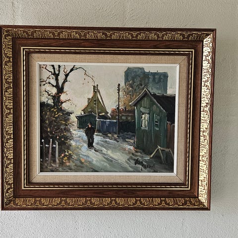 Maleri med portræt af ældre mand, der sidder i en stol på en veranda med en dåse i hånden. Manden er iført blå overalls, lys skjorte og hat. I baggrunden ses gelænder og udsigt til have eller natur med aftenslys. Maleriet er indrammet i en bred, gylden træramme. Velegnet som vægudsmykning i stue, gang eller lignende rum.