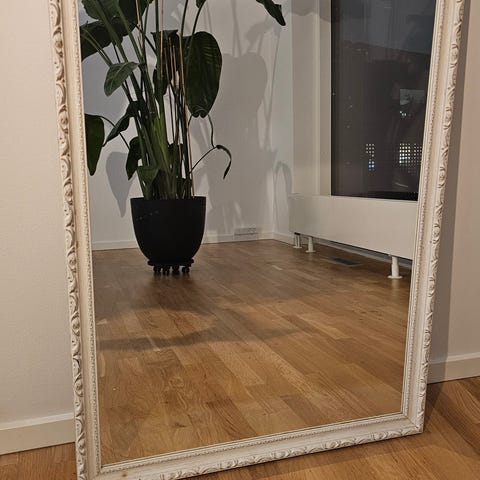 Rektangulært spejl med sølvfarvet, ornamenteret ramme. Rammen har klassiske dekorationer i hjørner og midterstykker, som giver et detaljeret og traditionelt udtryk. Spejlet egner sig til brug i entre, stue eller soveværelse og kan enten stå op ad væggen eller hænges op efter montering af passende ophæng.