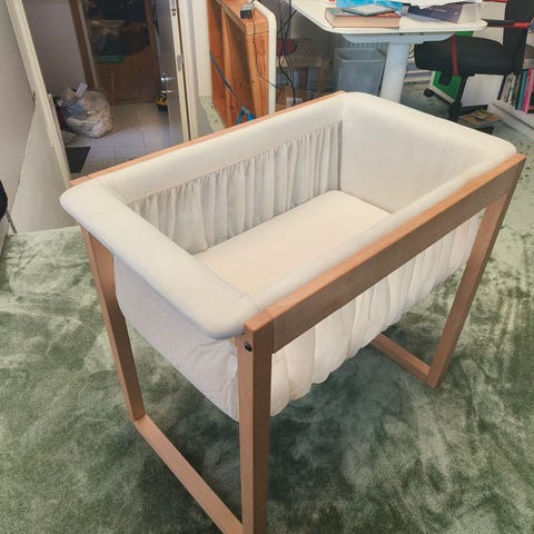 Materialer vuggeramme: Massiv bøg (ramme / ben) Lamineret birkefiner (madrasbase)
