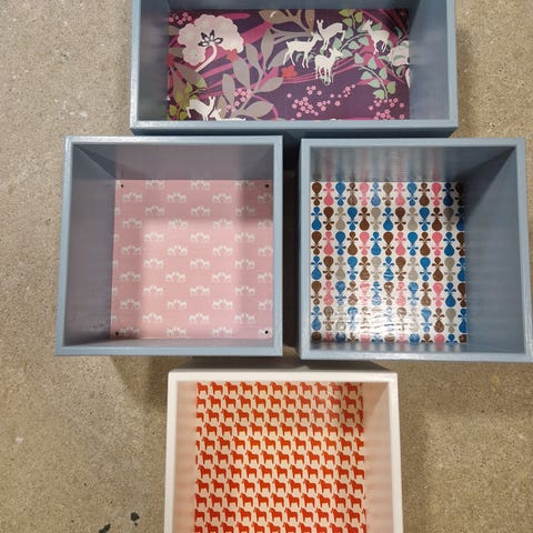 42 vintage bogkasser i forskellige størrelser og mærker sælges samlet. 20 kasser fra Sahva med flotte profiler og samlinger. 22 klassiske bogkasser fra Trævarefabrikkerne. Alle kasser har huller i bagklædningen og trænger til rengøring.