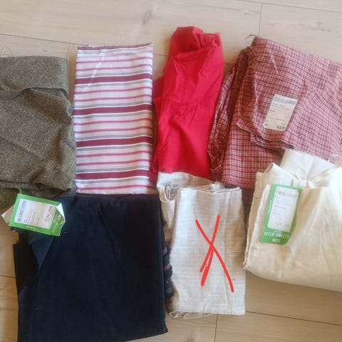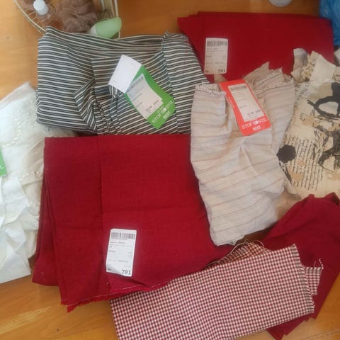 masser af stof, der er en del meter sammenlagt, de fleste stykker er bouclé, så er der 2 stykker bomuldslærred og 1 stykke kraftig struktur hør, kan med fordel bruges som foer - søde juleting mm, det er rester fra sy-tiden, så er du kreativ, så kan det sagtens bruges, sælges samlet - kommer fra røg & dyrefrit hjem.