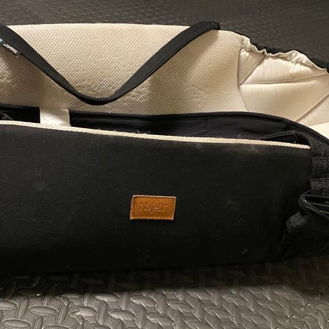 Den har en yderligere strop som nemt kan tages frem (sidder i en lille lomme på selve liften med en lynlås) så man kan bære den med baby i over skulderen. Fedt når man lige har født fordi det ikke belaster arme og ryg på en dårlig måde. Passer godt i en barnevogn.