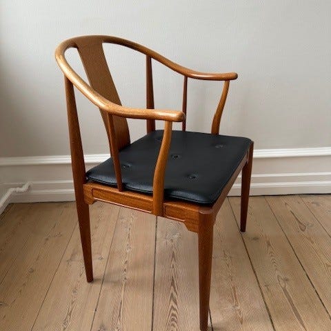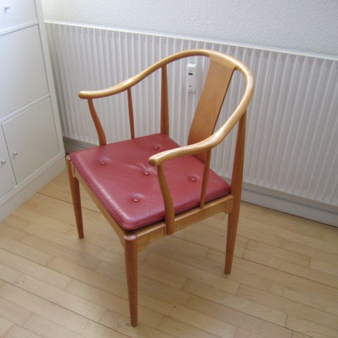 To fine kinastole i kirsebærtræ, med lækker cognacfarvet læderhynde. Stolene har ingen brud eller andre fejl og er ikke vakkelvorne. Prisen er pr. styk.