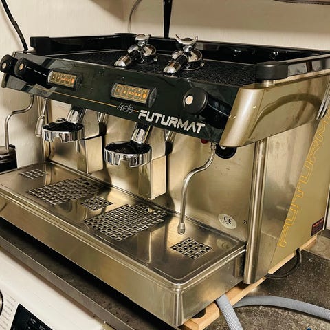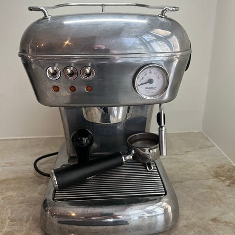 Smuk og ikonisk Bugatti Diva espresso maskine i elegant cremefarve sælges. En ægte italiensk designperle, der kombinerer stil og funktionalitet – perfekt til dig, der vil have caféstemning hjemme i køkkenet.