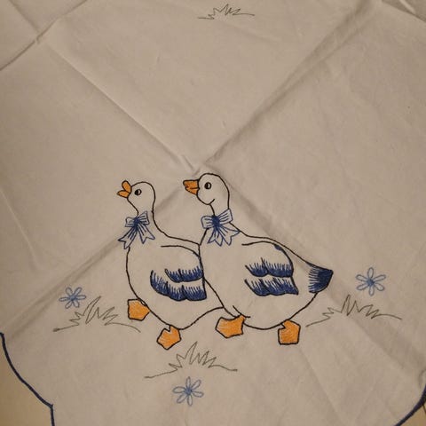 Dugen har en skjold, men ikke for søgt fjernet, og ikke haft den vasket. Tror den kan gå væk, hvis den rigtige person, får fingre i den. Dugen har en væve fejl. Kan ikke tage foto af skjolden, for bliver ikke at se på foto.