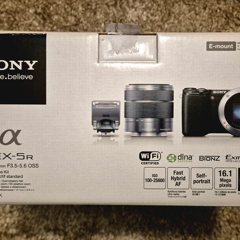 Sælges Sony NEX-5R kamera med Sony E f3.5-5.6/18-55mm (SEL1855) zoom-objektiv. Det er let brugt, næsten som ny og fungerer perfekt.