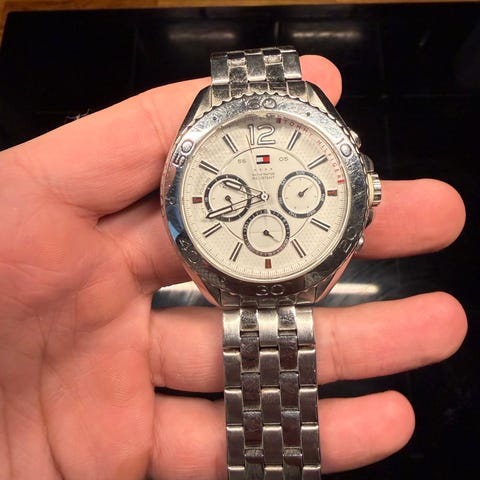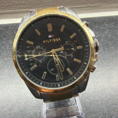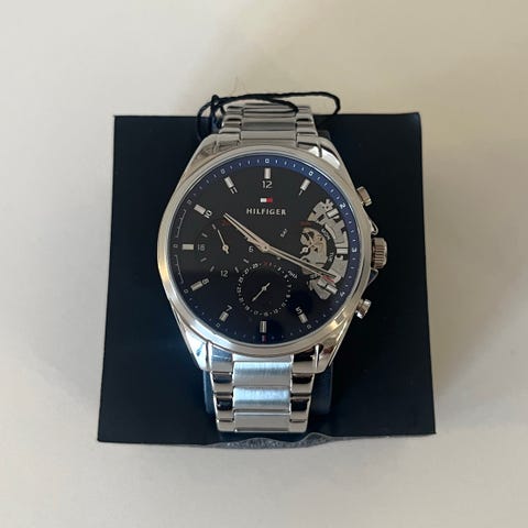 Tommy Hilfiger herreur med rund urkasse og metalrem. Uret har mørk urskive med tydelige timemarkeringer og visere. Der er flere små skiver på urskiven, som viser ekstra funktioner afhængigt af modellen. Leveres med original æske og mærkeseddel, som ses på billederne. Velegnet som klassisk armbåndsur til mænd.