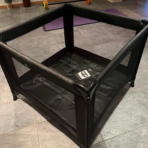 Kravlegården kan foldes sammen, og kan tages med på tur. Den vejer ikke ret meget.