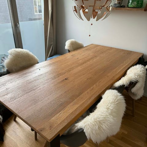 Sælger dette super flotte bord. Kan sælges samlet eller hver for sig. Bordpladen er træ som vi har fået lakeret hos autolakerer i flot klar blå. Høj glans. Har dog alm mange små ridser fra brug og et