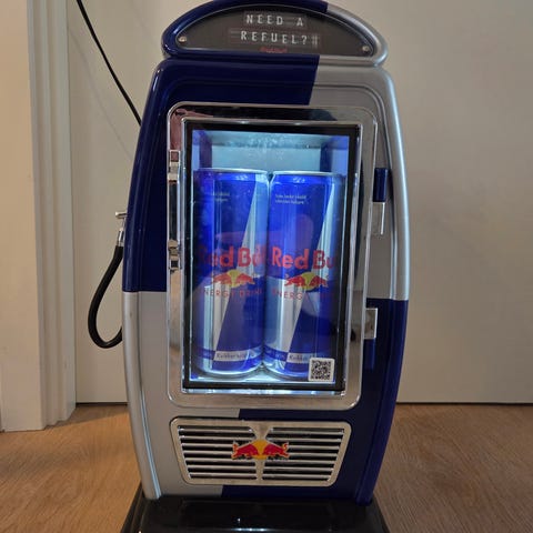 Red Bull køledisk med glaslåge og indvendig hylde. Enheden er udført i hård plast og metal med Red Bull-logo på siderne. Forsiden har gennemsigtig glasrude, og der er åbning/låge foran til adgang til indholdet. Køledisken er egnet til opbevaring og køling af drikkevarer i mindre mængder, f.eks. i kiosk, café, bar eller hjemmebrug. Strømtilslutning via ledning, som ses inde i skabet.