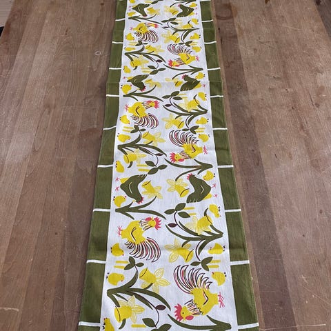 Bordløber i tekstil med påske motiv. Løberen har broderet mønster med hane, kyllinger, træer og kurv i flere farver på lys bund. Velegnet som bordløber eller dekoration på fx spisebord eller skænk i forbindelse med påske og forår.