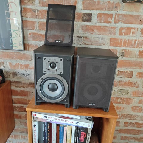 Højttaler, Akai, SA 1000, passiv, 60 W, God, Pæne kabinetter i valnød, spiller ok, de står på justerbare fødder, fronter er ikke originale.