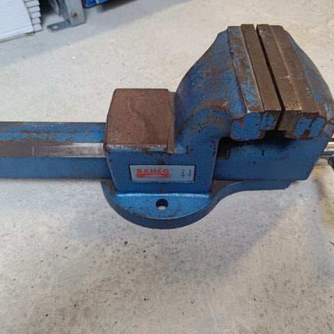 Meget fin skruestik fra tyske Heuer med kæbebredde på 120 mm og spændvidde på 150 mm. Den har en lille transportskade hvor håndtaget er blevet lidt skæv som det ses på billedet. Jeg fik en ny tilsendt til en discountet pris som kompensation, da jeg godt kunne bruge en ekstra. Den først tilsendte er dog aldrig blevet monteret og sælges derfor til den samme reducerede pris. Hvis du kan leve med håndtaget er lidt skæv får du en fin ubrugt skruestik til en fin pris.