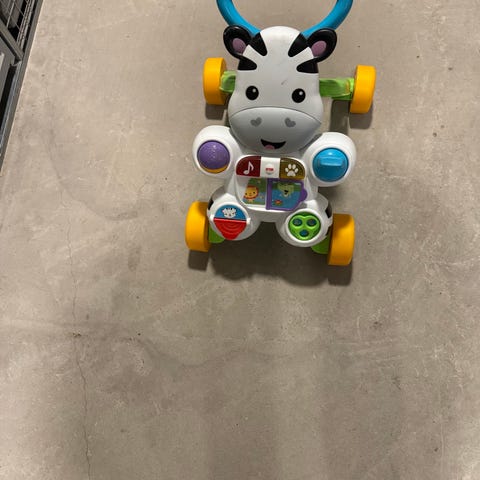 Fisher-Price gåvogn udformet som en zebra. Gåvognen er beregnet til små børn, der øver sig i at stå og gå, og har håndtag foroven til at holde fast i. Forsiden har flere farvede aktivitetsfelter med knapper og drejeelementer, som barnet kan trykke på og undersøge. Nogle af felterne har motiver og symboler, blandt andet musiknote og poteaftryk. Gåvognen har hjul og er lavet i plast i flere farver, herunder hvid, sort og gul med blå håndtag. Velegnet som støtte til de første skridt og som aktivitetslegetøj til baby og tumling.