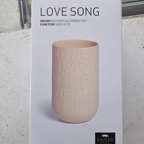 Kähler Lovesong vase i modellen H22 i farven indigo. Vasen er cylindrisk med præget tekst på ydersiden og glaseret inderside. Fremstillet i keramik og egnet til dekoration med blomster eller som selvstændigt indretningselement. Produceret i Portugal.