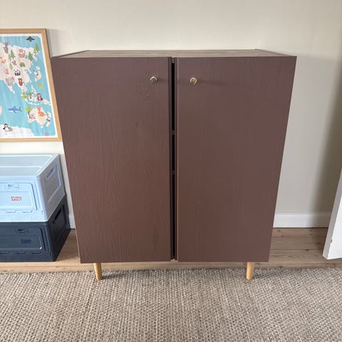 Ivar skab(e)/skænk fra IKEA. Som ses på billedet er der et i oprindelig størrelse og et mindre, som er halvt størrelse. Jeg har selv halveret dette, for at det passede det tiltænkte sted.