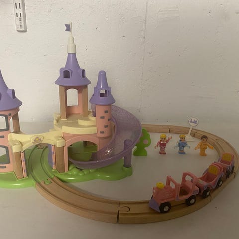 Med slot, flere toge, figurerne Mickey Mouse, Minnie og Anders and.