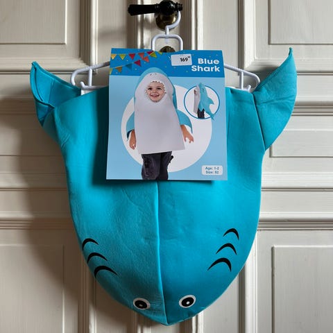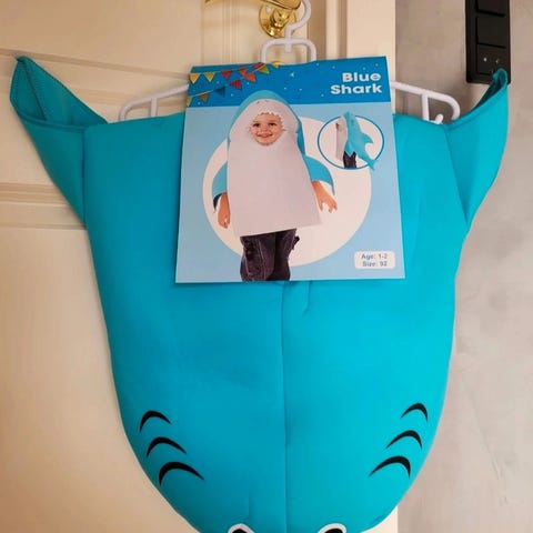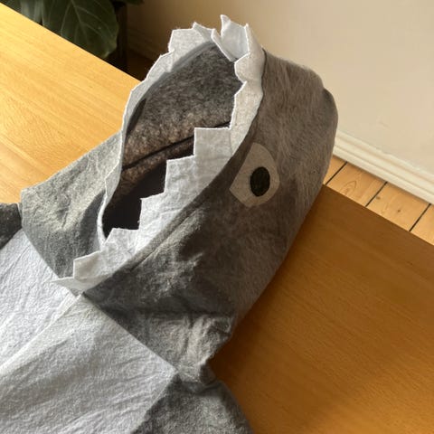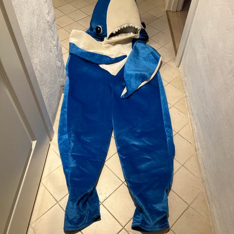 Hajfinnen på ryggen kan tages af og på kostumet, dragten er i fin stand og fejler intet.