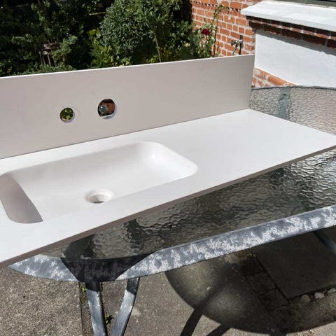 Ældre kuma dobbelt vask med amaratur og plejeserie.