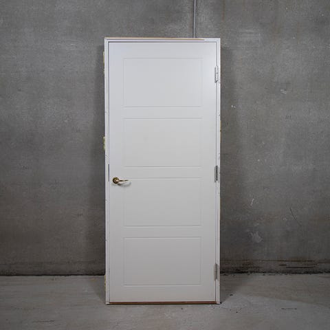 209 x 89 cm Indvendig dør med karm i dybde: 130 mm. Døren er højrehængt med massiv dørplade med fire fræset felter og messinghåndtag. Fra markant 5 etages hjørneejendom på strøget i København, Frederiksberggade 2 / Gammeltorv 24.