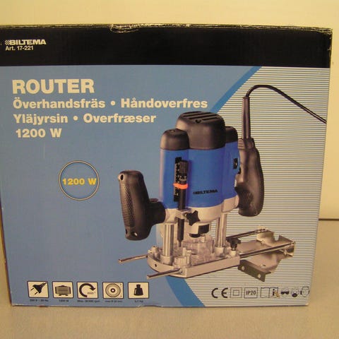 Black & Decker KW850E overfræser med 1100W motor. Drift ved 230V / 50Hz, 5A. Omdrejningstal kan justeres mellem ca. 8.000 og 28.000 omdr./min. Maskinen har dybdeindstilling og fjederbelastet dykfunktion.