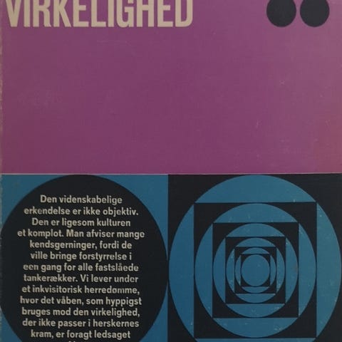 Bog med titlen "Virkelighed". Paperback-udgave med blå og lilla forside med grafisk motiv. Bagsiden indeholder citater og omtaler af bogen. Egnet til læsere med interesse for videnskabsteori, erkendelse og tænkningens historie.