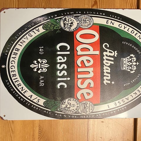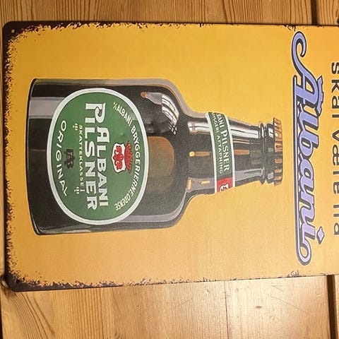 Albani øl metal skilt med pilsner motiv. Skiltet viser to Albani pilsnerflasker og et fyldt ølglas samt tekst langs siden. Forsiden har trykt motiv med patineret udtryk, bagsiden er ensfarvet metal. Velegnet som vægdekoration i bar, køkken eller opholdsrum. Skiltet er cirka 20 × 30 cm