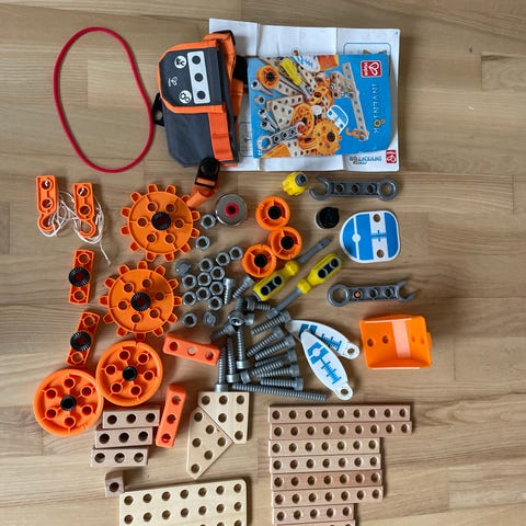 Klodser i mange forskellige farver og former fra Hape + andre klodser (huse) og vejskilte